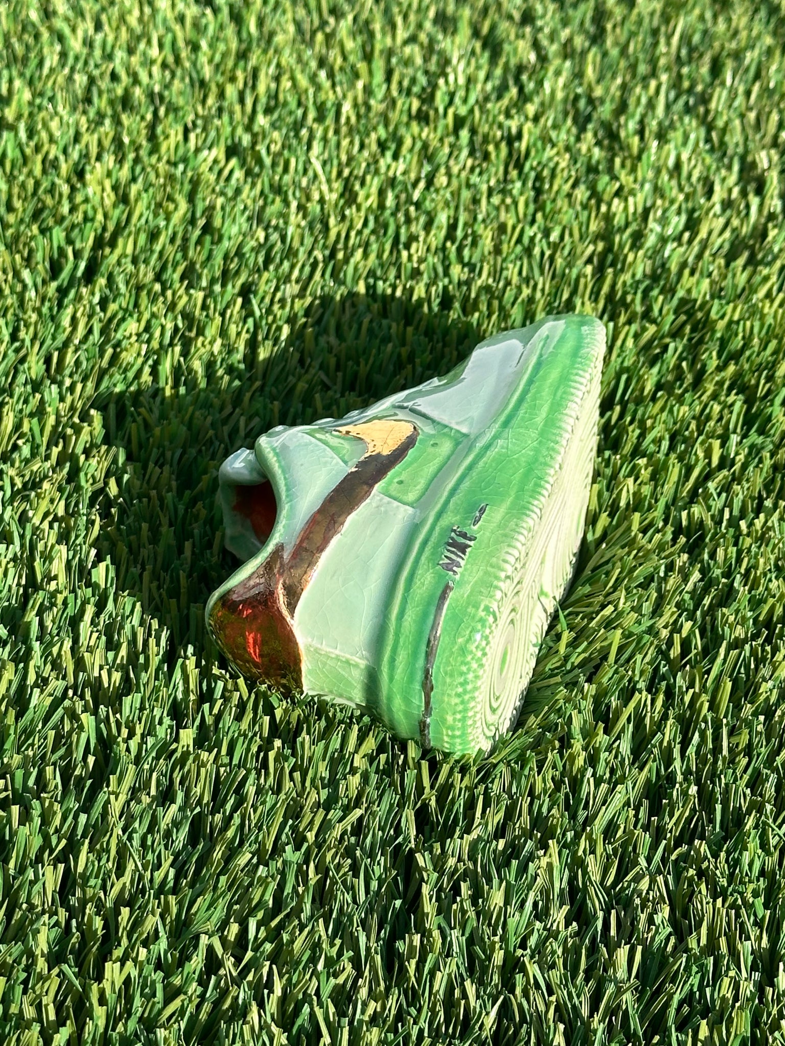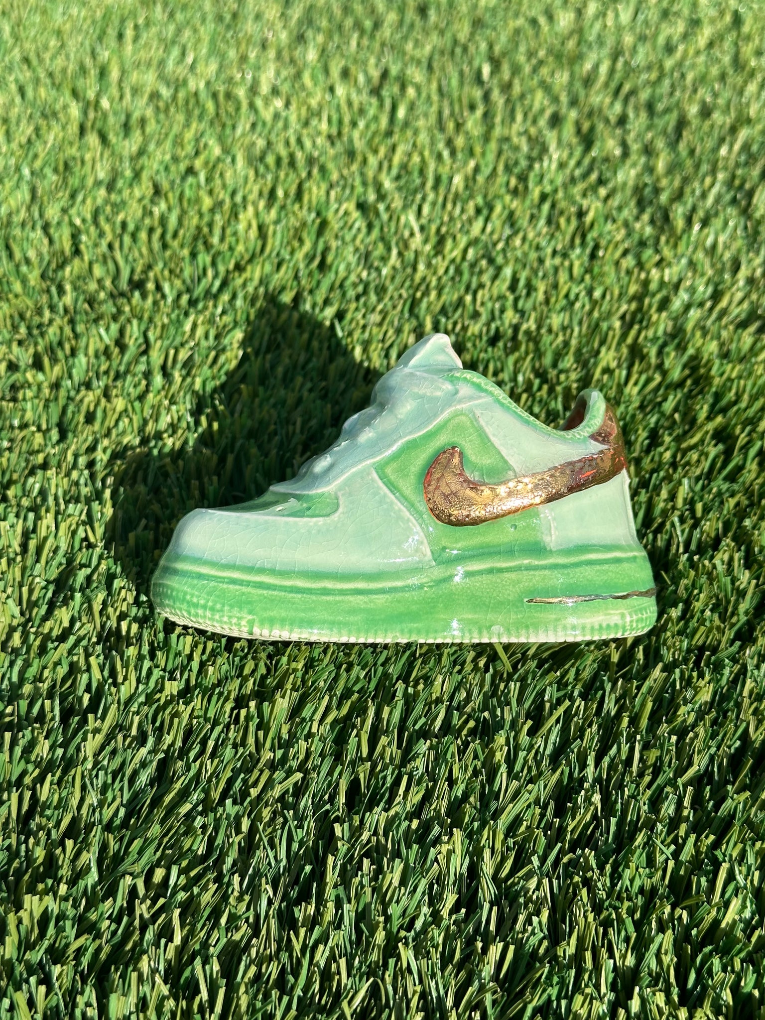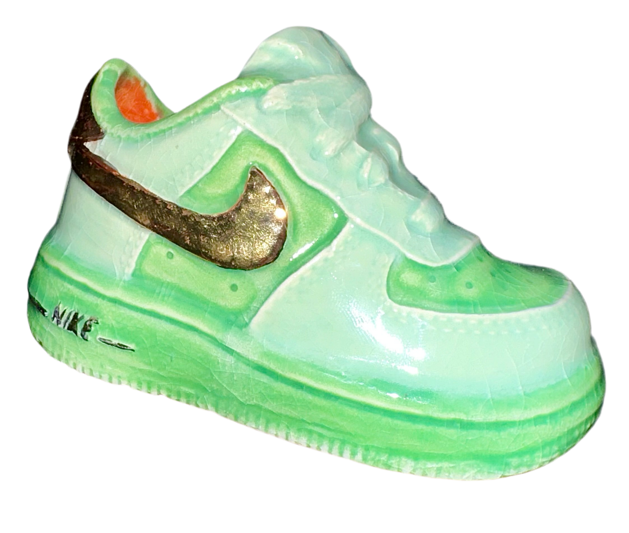 Low top Air Force 1 baby sneaker reimagined as a planter, equipped with two drainage holes. Slip-cast porcelain customized with black and red underglaze.